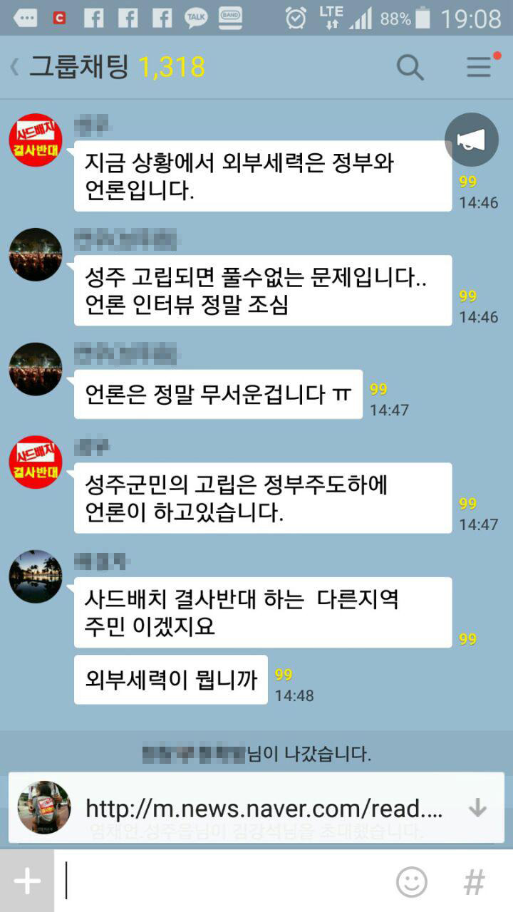 18일 오후 3시3분께 경북 성주 주민들이 모여 있는 메신저 서비스 카카오톡 그룹 채팅방에 한장의 사진이 올라왔다. 경북 성주군 성주읍 경산리 성주문화원 들머리에서 성주 주민이 아닌 ‘외부인’ 9명이 이렇게 적힌 펼침막을 내걸고 집회를 하고 있는 사진이었다. 애국기독연대, 월드피스자유연합, 사대개혁추진국민운동본부라는 단체들은 지난 16일부터 성주에서 ‘사드 찬성’ 집회를 하고 있다.이 사진은 집회 장소를 지나가던 한 성주 주민이 찍어 채팅방에 올렸다. 이 주민은 사진과 함께 “문화원 앞에서 또 저 카고 있네요. 듣다 듣다 속이 천불 나서 와버렸어요. ㅠㅠ”라는 글을 올렸다. 이 사진을 본 주민들은 ‘ㅋㅋㅋ 절대 무대응 하셔야 합니다’, ‘내부분열 일으키러 왔어요. 무시하세요’, ‘아무리 화나도 대응하심 안 돼요’ 등의 글을 올렸다.이 채팅방은 원래 성주 주민들이 먹거리 공동 구매 목적으로 만들어 운영하던 곳이다. 하지만 지난주 정부가 성주 사드 배치를 발표하면서 사실상 ‘사드 배치 반대’ 채팅방으로 운영되고 있다. 원래 채팅방에 있던 주민 200여명이 다른 주민들을 초대하면서 순식간에 참여자가 불어났다. 현재 이 채팅방에서 대화를 나누는 사람은 1318명이다. 채팅방 최대 인원수가 넘어, 한명이 채팅방에서 나가야만 다른 한명이 들어올 수가 있다.