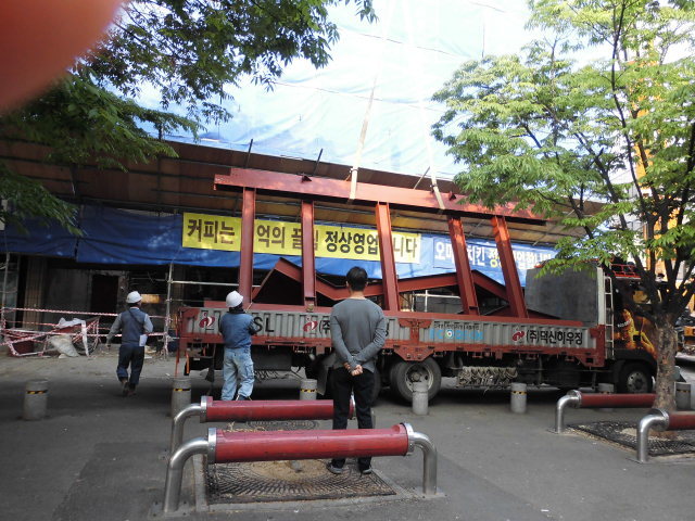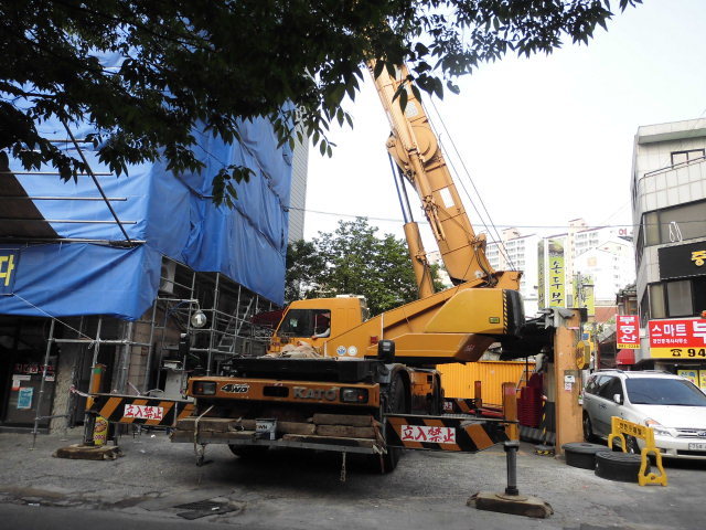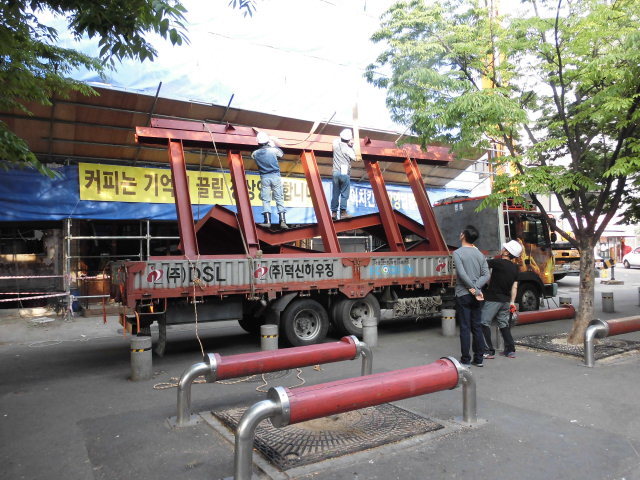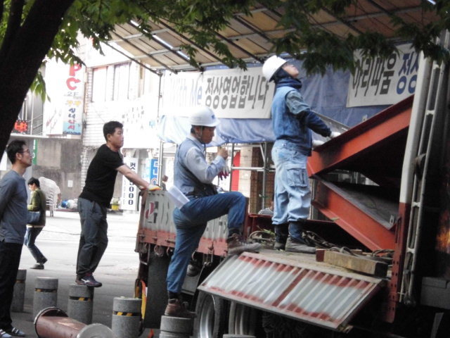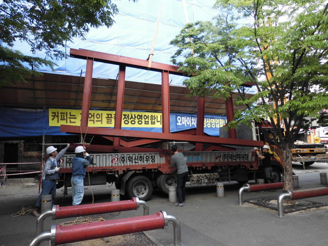 공사장 표정읽기 2톤 철빕 지상으로 옵겨 광원역 대로변 작업자 긴장돼는 모습 지켜봐