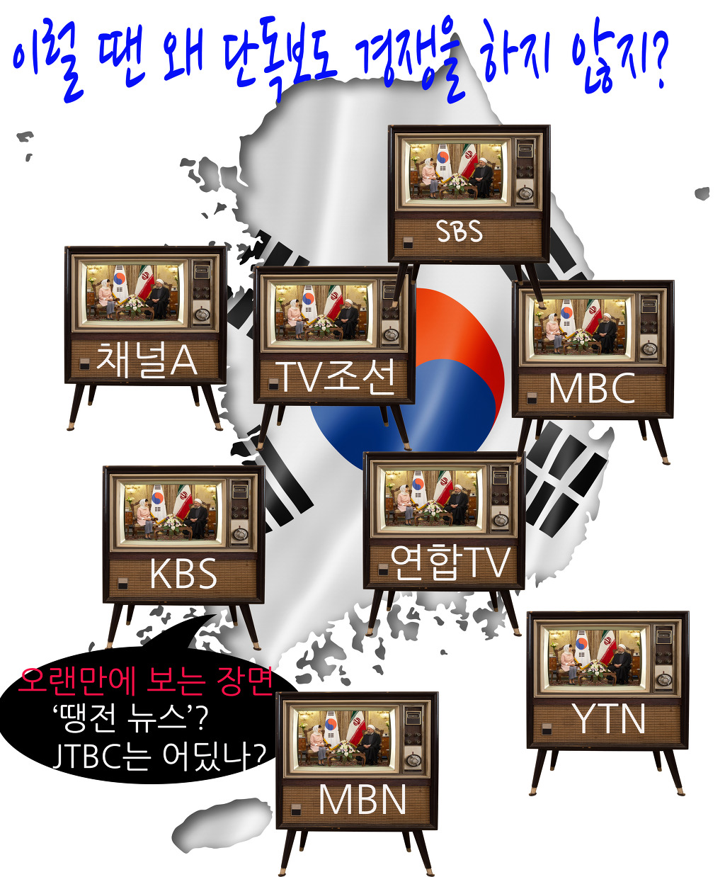 박대통령의 이란 방문을 계기로 52조원어치의 수주를 했다고 전 언론이 보도한 가운데 한국의 모든 TV들이 동시에 생중계해 시청권을 빼앗았다. 전두환 대통령 시절 이후 오랜 만에 보는 광경이었다.