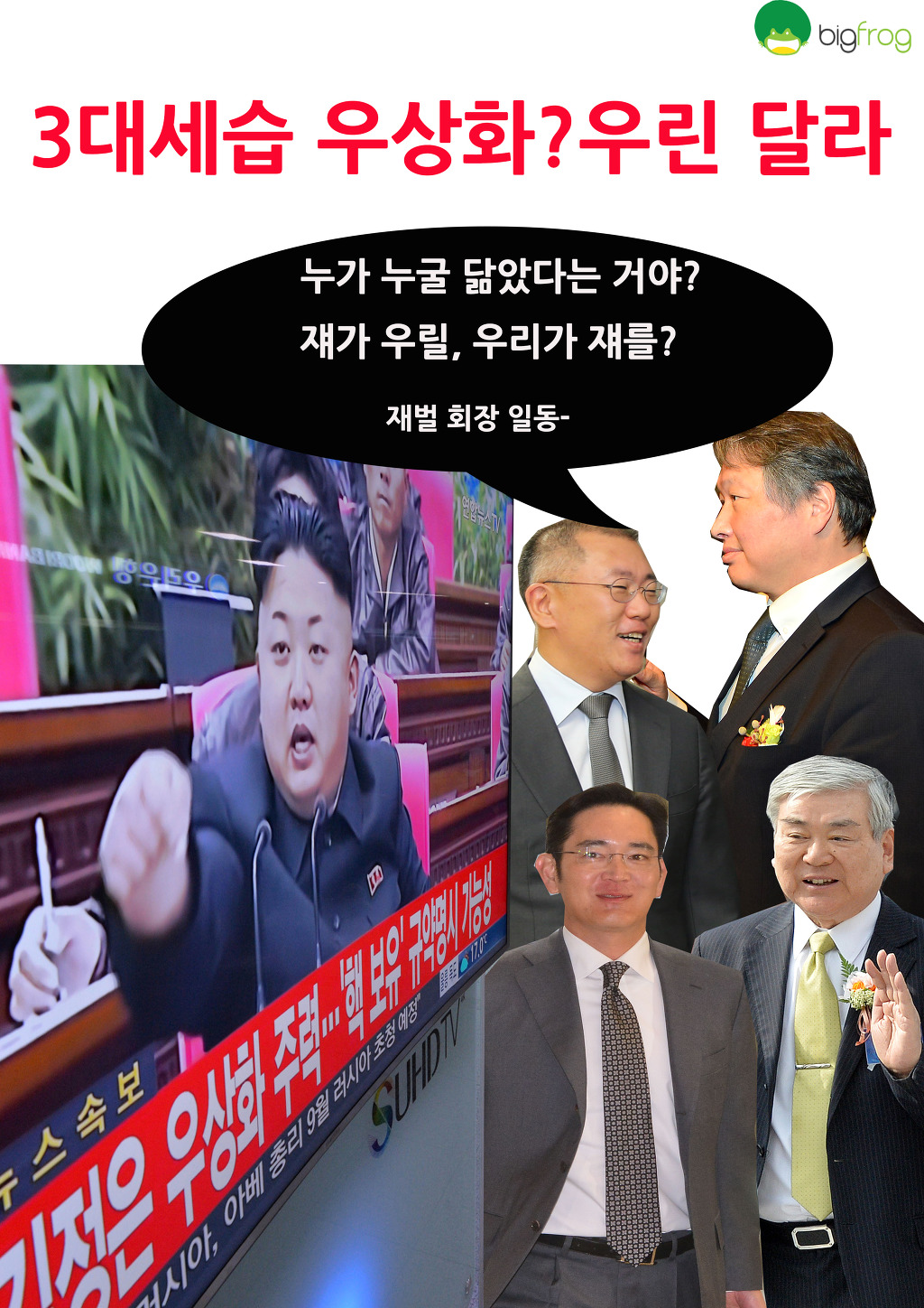 북한이 노동당대회를 열어 ‘김정은 대관식’으로 3대 세습 완성을 대내외에 알렸다. 독재를 하건 3대 세습을 하건 인민이나 숙청하지 말고 잘 먹여 살린다면야 무슨 얘기를 하겠느냐마는... 고개를 돌려 헬조선의 청년입장에서 재벌을 바라보면 왠지 고개가 갸우뚱해진다. 재벌들은 “우린 다르다”고 주장하겠지만 글쎄....