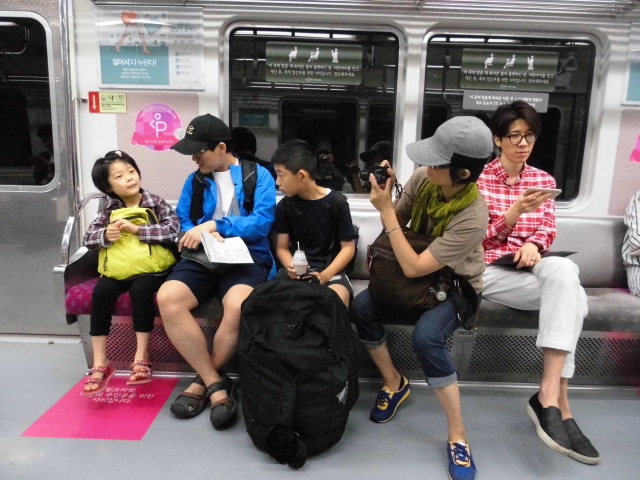 5호선 운행중 중국인 여행객 가족끼리 사진촬영모습