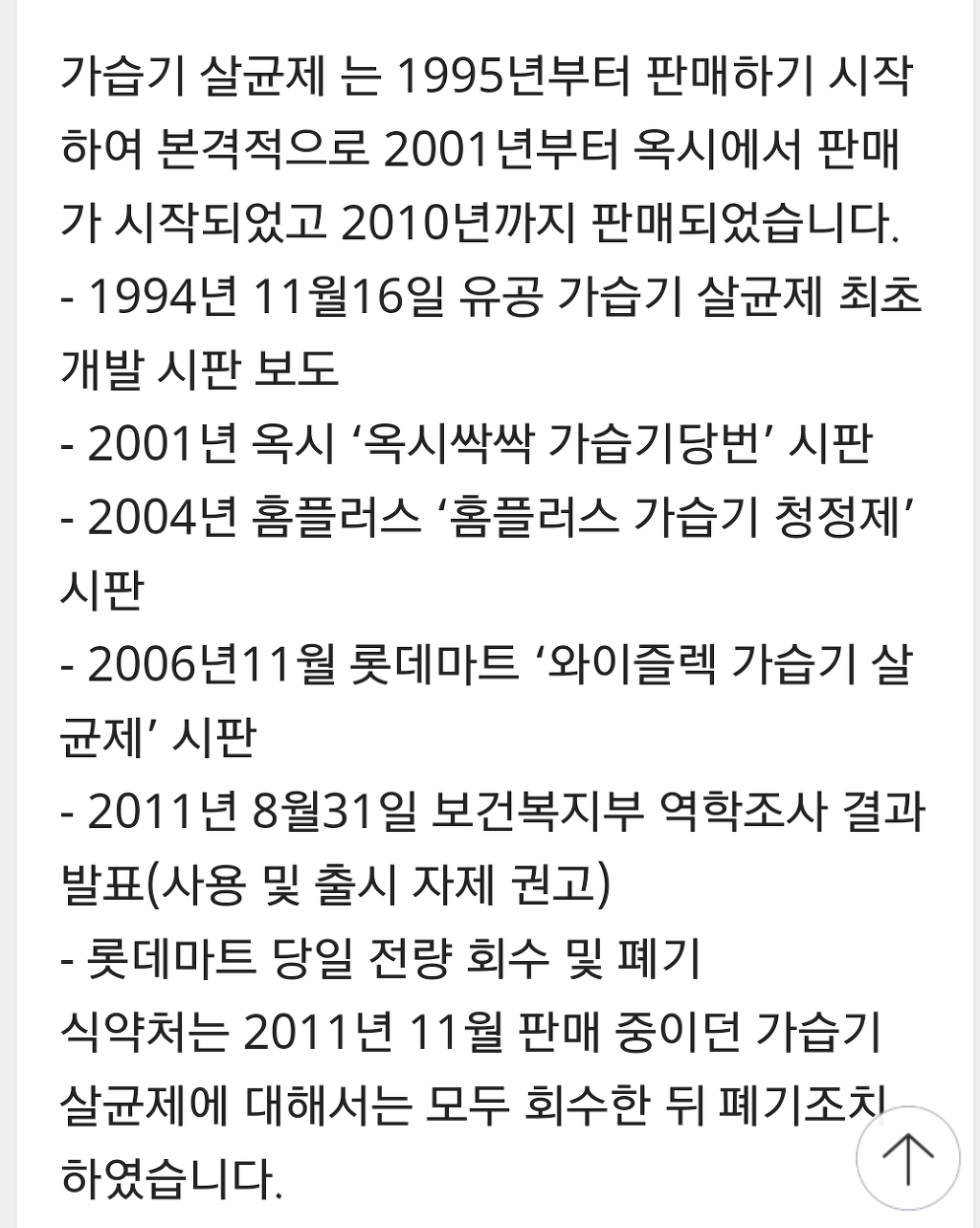 식약처는 2011년 11월 판매 중이던 가습기 살균제에 대해서는 모두 회수한 뒤 폐기조치 하였습니다.