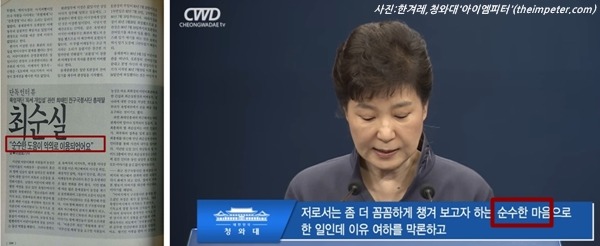 JTBC의 최순실 태블릿 PC 보도가 나가고 10월 25일 박근혜씨는 대국민담화를 합니다. 박씨는 ‘순수한 마음으로 한 일인데’라는 표현을 사용합니다. 한겨레에 따르면 이 표현은 최순실씨가 1987년 월간지 ‘여성중앙’과 했던 인터뷰에 등장합니다.