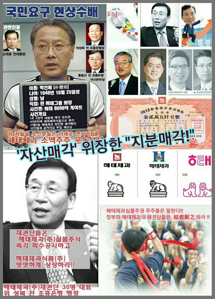 이들은 또 “해태제과(주) 매각행위는 위법 차원을 넘어 건전한 주식투자를 상대로 불법을 행한 것”이라며 “이는 국민의 눈을 가리고 어마어마한 금액을 탕감 시켜주기 위해 공적자금을 투입한 대표적인 혈세 낭비”라고 지적했다.