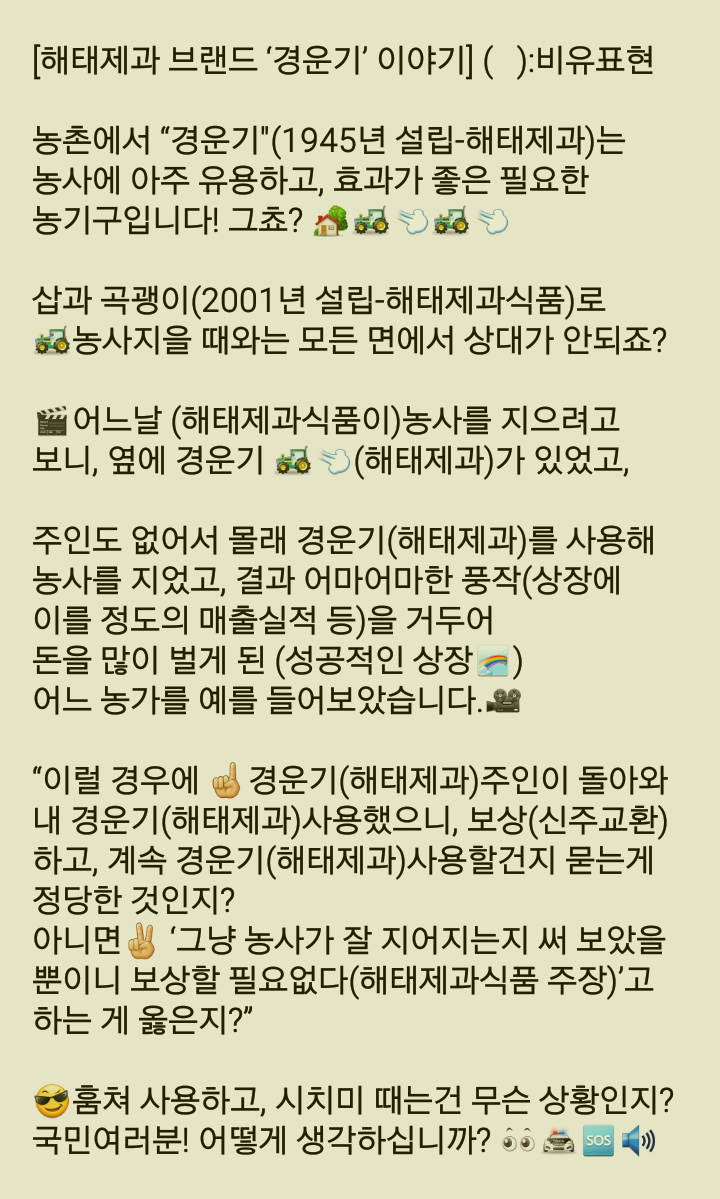 한편 이번에 해태제과(주)의 법인명 매각 사실이 알려지면서 소액주주들의 반발이 극에 달하고 있다. 이미 운동본부 홈페이지에는 듣기에 조차 섬뜩한 문구들이 도배질을 하고 있다. 또 이들 사이에서는 해태제과를 인수하는 회사 상품에 대해 독극물 테러도 서슴지 않겠다는 말까지 나오고 있다.