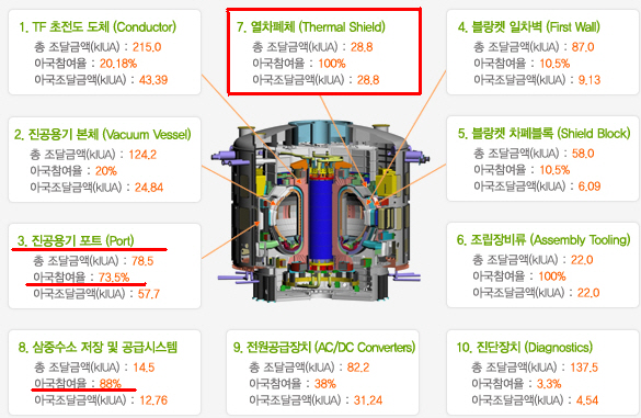 저들 댓글매국노들이 퍼뜨리는 거짓말과 거짓논리는 우리나라가 강대국 6개 나라와 공동연구를 하기로 약정이 되어 있어서 외국 기술자들의 연구소 합류는 당연하다, 또 기술공유를 하는 것이므로 우리의 독보적 기술이라 하더라도 노하우를 알려주어야 하는 의무가 생긴다는 등등의 거짓을 퍼뜨리고 있습니다. 공동연구의 의미는 기술노하우를 나누는 것이 아니고 기존의 핵융합기술 분야에서 각국이 독보적으로 완벽하게 성공한 기술은 자국의 분담에 의해 그 기술을 공동프로젝트를 수행하는 연구소에 구현시켜 놓거나 완제품을 납품하는 방식의 공동연구입니다. 그러므로 우리의 독보적 기술인 열차폐막은( 아래 그림에서 100% 분담율을 가진 분야는 우리나라가 유일하게 소유한 기술이고 특허가 존재한다는 사실을 잊지 마시기 바랍니다.)기술을 전수해 주는 것이 아니고 완제품을 만들어 제공하는 방식입니다.
