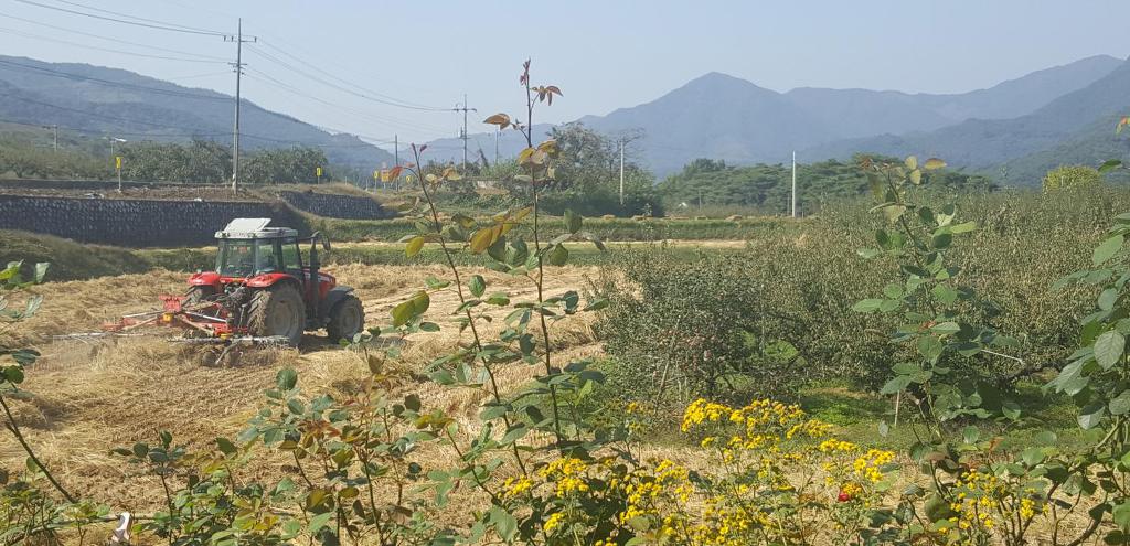 사진설명 : 창문 밖 가을걷이를 끝낸 다랑논에서 농부가 트랙터로 겨울에 먹일 소 사료로 볏짚을 거두고 있는 풍경이다.