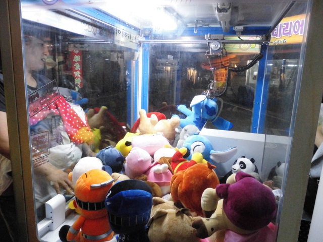 저녁밤거리 시장 진입로골목가 뽀기자판기 30대중반의 부부 박스안에 가득찬 인형 뽑으려고 작동 수번 하였으나 걸리다 사발이 힘빠져 드려올리다가 빠져 인형판메업자 3발이 시간대로 강약 시차로 입력해놔 인형물고 끌려올릴 파워 조작 사람이 많이 사용할시간에 꺼내긴 힘드려 남편은 아기앉고 부인은 어딜 찝어야 잘걸릴가 살피며 조언해줘 그려나 몇번 헛수거 포기하고 귀가길나서