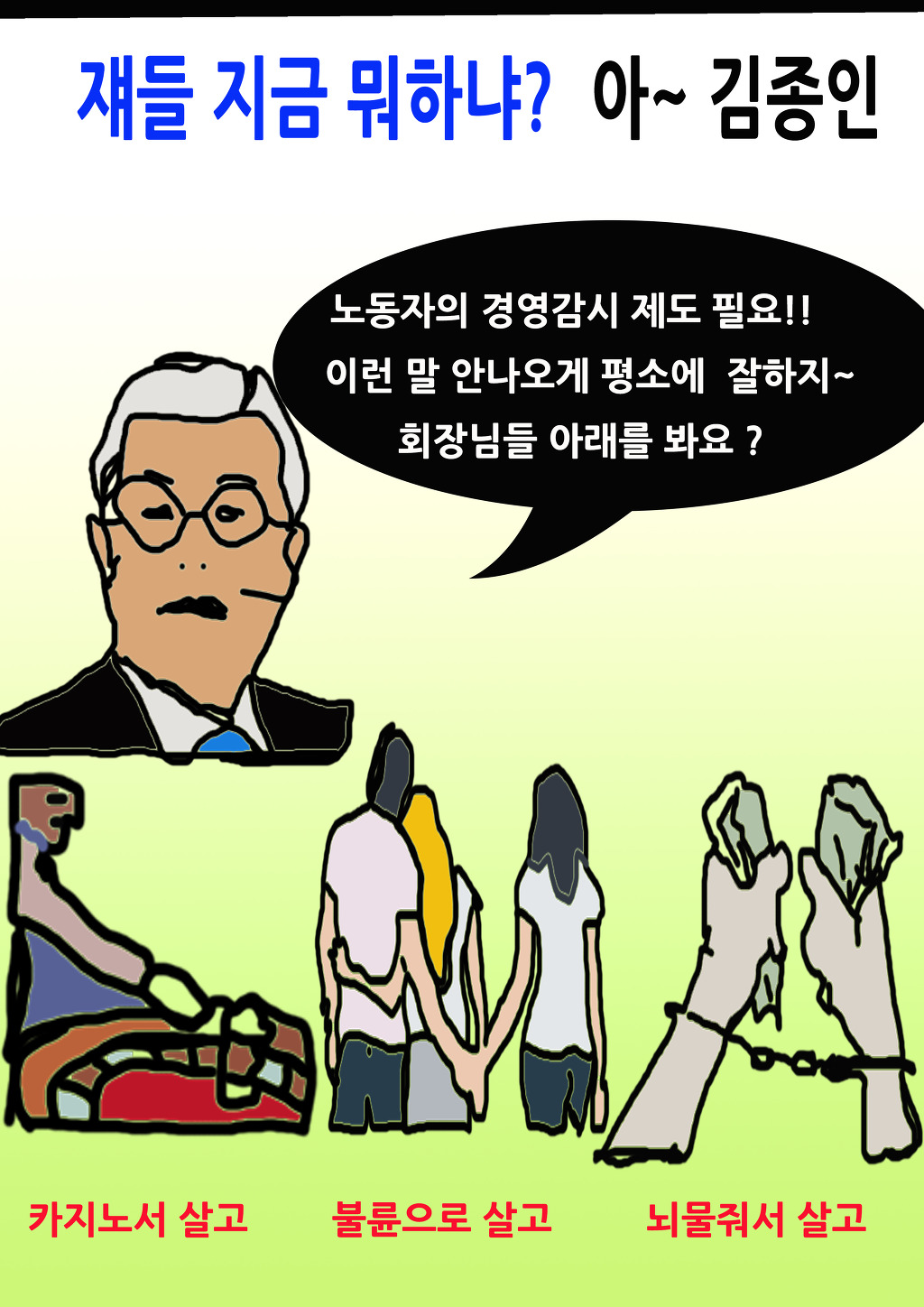 더불어민주당의 김종인 비대위 대표가 노동자의 경영감시 제도가 필요하다고 말했다. 경제민주화를 떠나 수만명의 삶의 터전인 대기업을 망가뜨리는 회장님들의 ‘오너리스크’를 막는 장치가 필요하다는 말일 것이다.