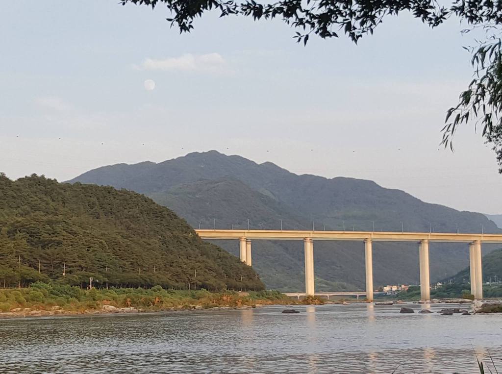 사진설명 : 어제 유월 보름 유둣날 해질 무렵 섬진강에 뜬 낮달이다.