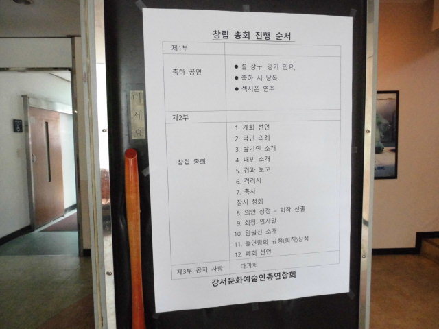 먼저 식전 축하공연 설장구 경기민요 축하 시 낭송 강서문인회지부 시분과 회장 신재민 시인 축시 강서mk 실용음익 회원 쎅스폰 개회사 선언 국민의례 발기인소개 내빈소개 경과보고 격려사 축사 정회 내빈퇘장