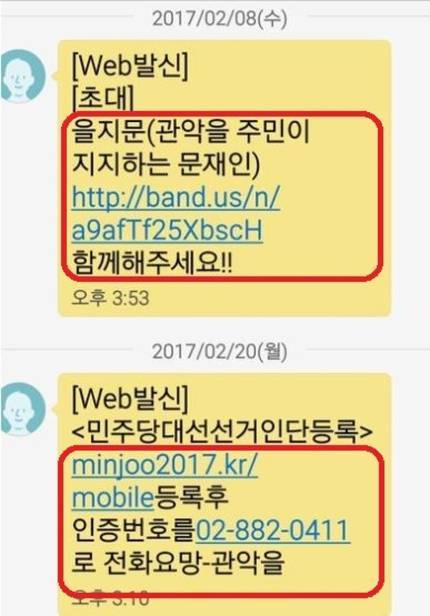 관악을 지역위원회에서도 인증번호를 전화로 알려달라는 문자 메시지가 당원들에게 보내졌다. 발신번호는 관악을 지역위의 사무실 전화번호다. 지역위 사무실 번호로 문 전 대표 지지자들의 밴드 모임인 ‘을지문(관악을 주민이 지지하는 문재인)’ 초대 문자 메시지도 대량 발송됐다. 관악을 지역위원장인 정태호 위원장은 노무현 정부에서 청와대 대변인을 지냈고, 문재인 의원 정무특보를 지낸 ‘친문’ 인사다.