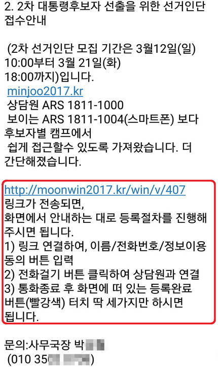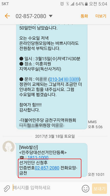 지역위 사무실 번호로 당원들에게 문자를 보내 ARS인증번호를 요구했다.