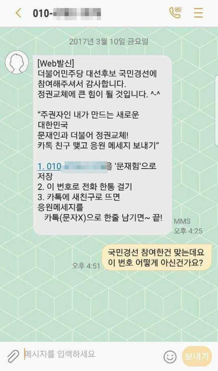 지역위원회 당직자가 선거인단으로 등록한 당원들에게 문재인 후보를 선전하는 카카오톡 메시지를 보냈다.이미지 크게 보기