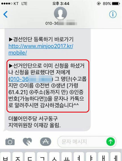 부산 서구동구 지역위원장 명의로 선거인단 신청자들에게 개인정보와 ARS 인증번호를 요구하는 문자가 발송됐다.