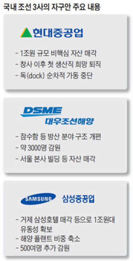 대우조선해양이 잠수함 건조 등 방위 산업 부문을 분사하고 중국 산둥에 있는 조선소를 매각하는 내용을 포함한 3조원 규모의 자구안을 20일 주채권 은행인 산업은행에 제출했다. 현대중공업은 경영 정상화 방안의 하나로 1973년 창립 이후 43년 만에 처음으로 생산직 희망퇴직을 단행키로 했다. 삼성중공업은 지난 17일 1조원대의 자구안을 주채권 은행인 산업은행에 제출했고, 채권단의 요구에 따라 보완 작업을 하는 중이다.
