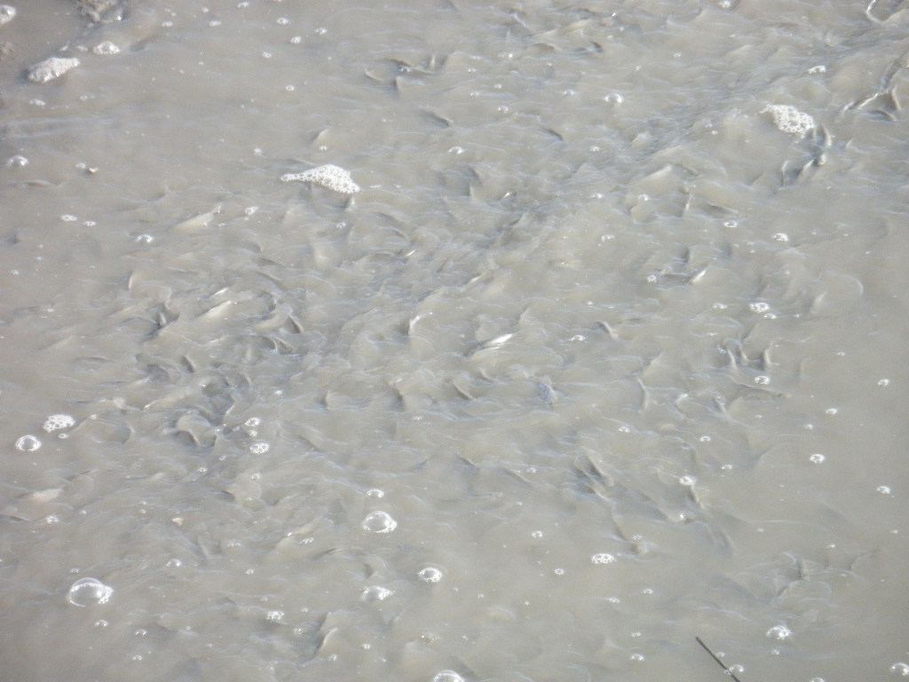 바닷물이 밀쳐들려오이 잔고기때 쓸려 마구 물길따라 밀려와