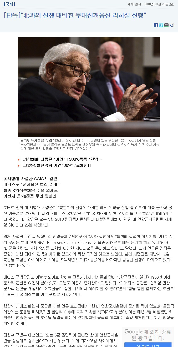 “北과의 전쟁 대비한 부대전개옵션 리허설 진행”▲○