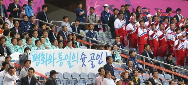 1일 오후 인천 문학경기장에서 열린 북한과 일본의 여자 축구 결승전을 관람하러 온 새누리당 의원들이 ‘평화와 통일의 슛 골인!’이라는 현수막을 펼쳐든 채 북한팀을 응원하고 있다.