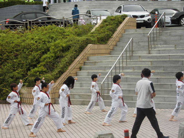 태권도장 관장님 대단해 남을 의식전혀 않해 행사장 진입로 중앙계단아래 관생 집합시켜 강도높은 연습 재촉 구령 야몰차