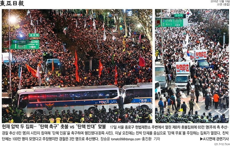 밖에서도 흔든다. 박사모 등이 탄핵반대 집회를 열면 조중동 등 보수신문은 이를 띄우는 식이다.동아일보는 19일 1면에 “헌재 압박 두 집회… ‘탄핵 촉구’촛불 vs ‘탄핵 반대’ 맞불” 을 배치했으며 같은 날 조선일보와 중앙일보도 규모면에서 차이가 큰 촛불과 맞불이 대등한 것처럼 편집했다.