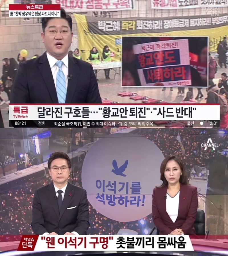 ▲ TV조선과 채널A의 최근 촛불집회 관련 보도화면 갈무리
