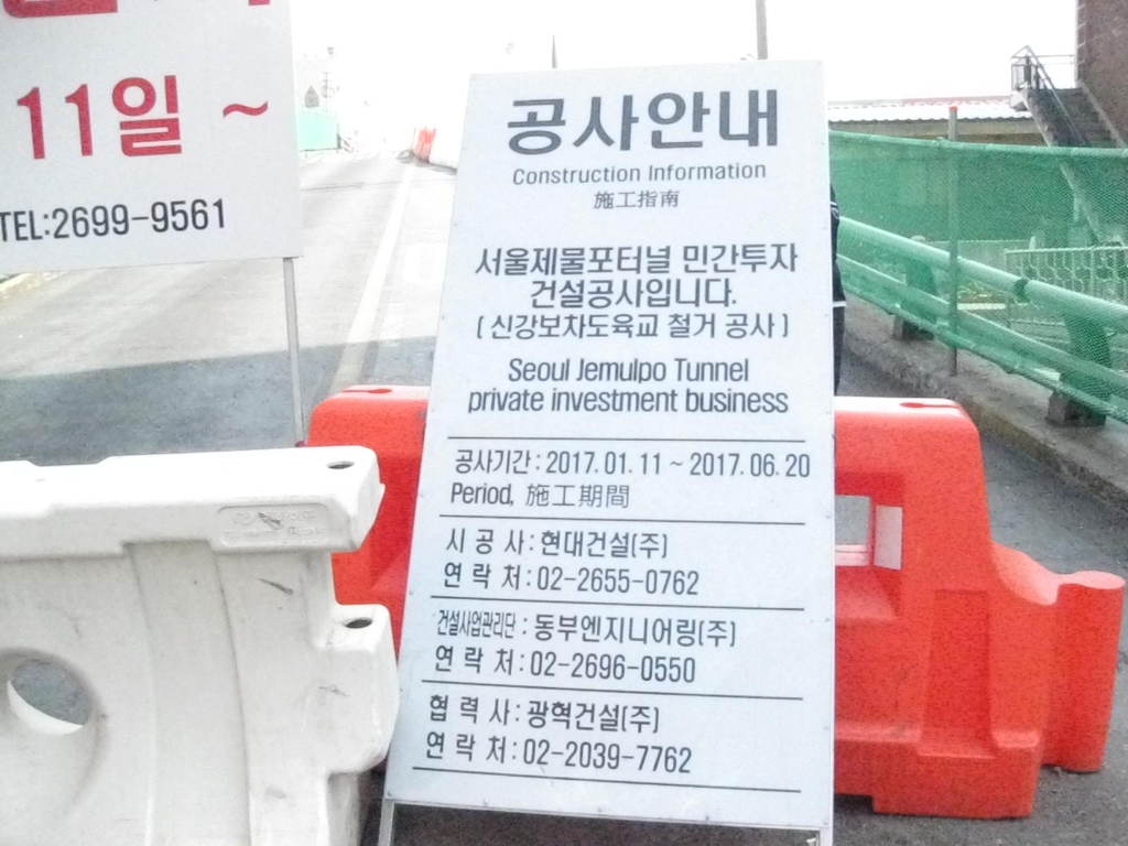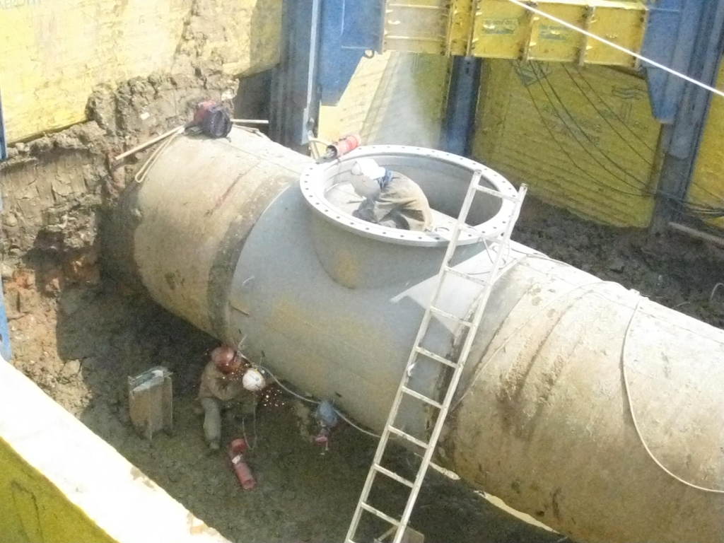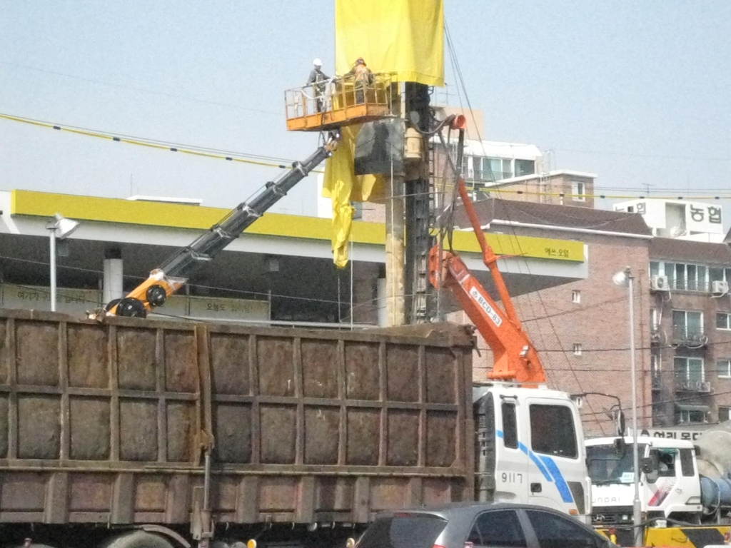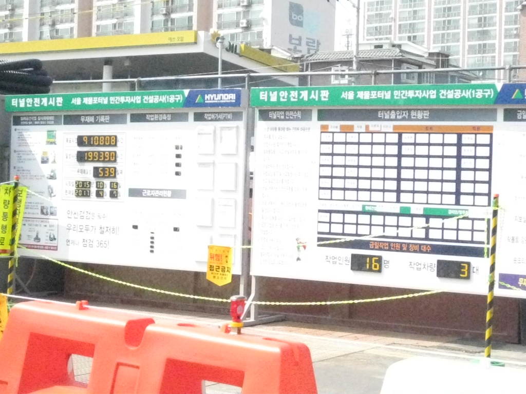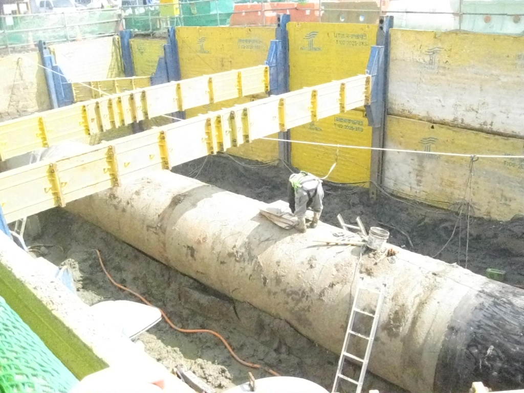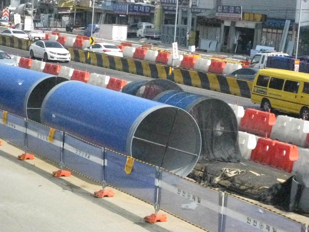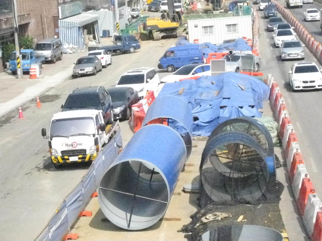 상수도관 매설 반지름 2미터 경인고속도로 북쪽 편 남쪽편은 화곡동에서 인천 제물포 까지 지하 도로 굴착 공사 현장 바닥 흙퍼내기 작업중