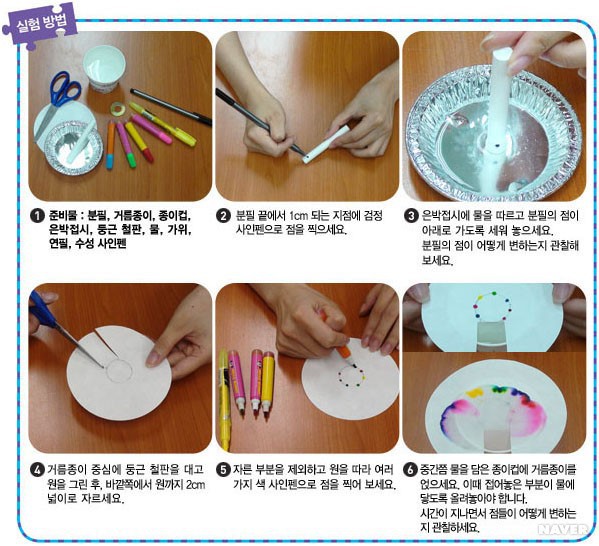 1) 수성 사인펜으로 점을 찍은 분필을 물 위에 올려놨을 때