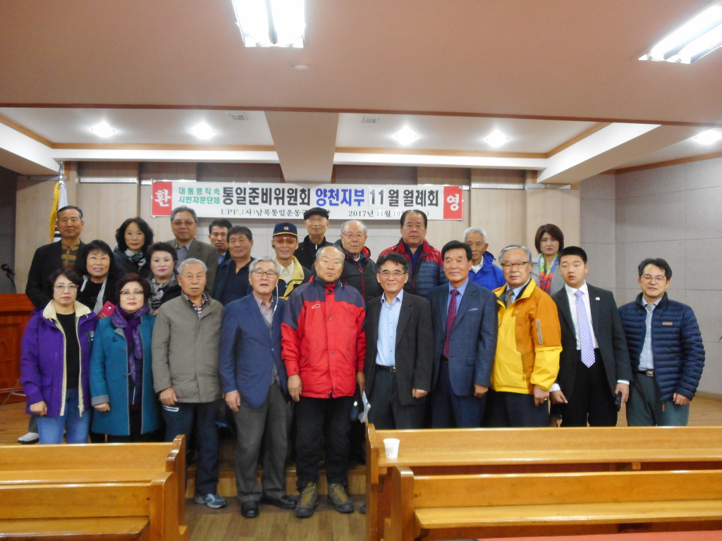 2017년 11월 10일 오후18시 양천 가정교회 이수남 지부장님의 사회 남북통일방향 대한 세미나 갖져 양천지역 통일 평화대사 30여명이 참석 양찬수고문의 시국과 관련된 시사포럼 소개 좌파의 불편한관계 주제로 강의를 경청해
