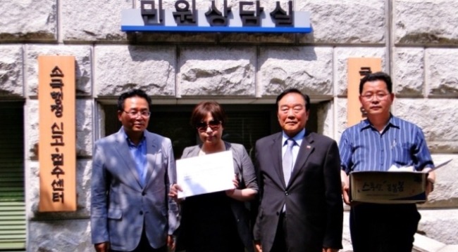 △기자회견을 마친 후 감사원 민원실 앞에서 기자들의 요청으로 인증샷을 하고 있다. (왼쪽부터) 이희범 대한민국애국시민연합 사무총장, 이애란 자유통일문화원 원장, 박흥식 부정부패추방실천시민회 상임대표, 김상진 애국연합 사이버감시단 단장