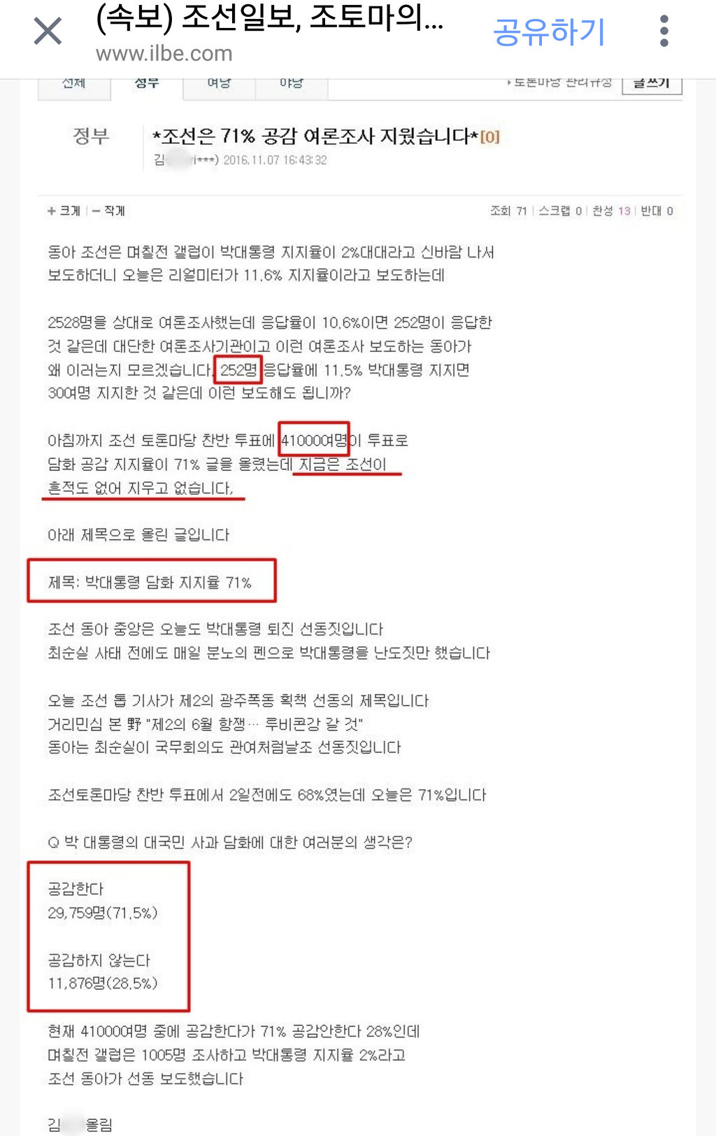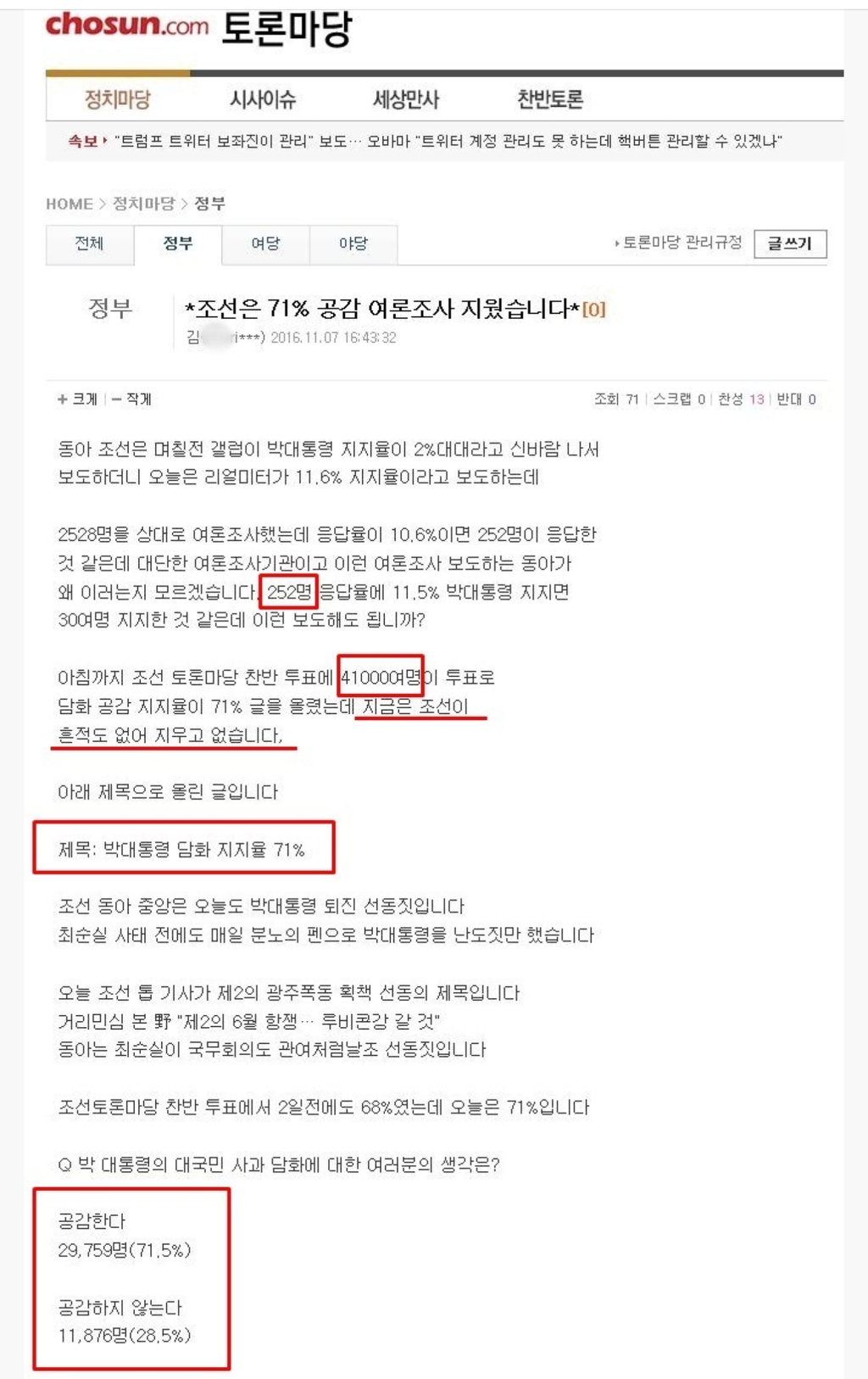 [출처] (속보) 조선일보, 조토마의 여론조사 ( 박대통령 담화 지지율 71% ) 삭제 논란
