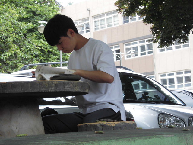 고등학교 뜰아래 나뭇밑에서 공부하는 학생 눈에띄어
