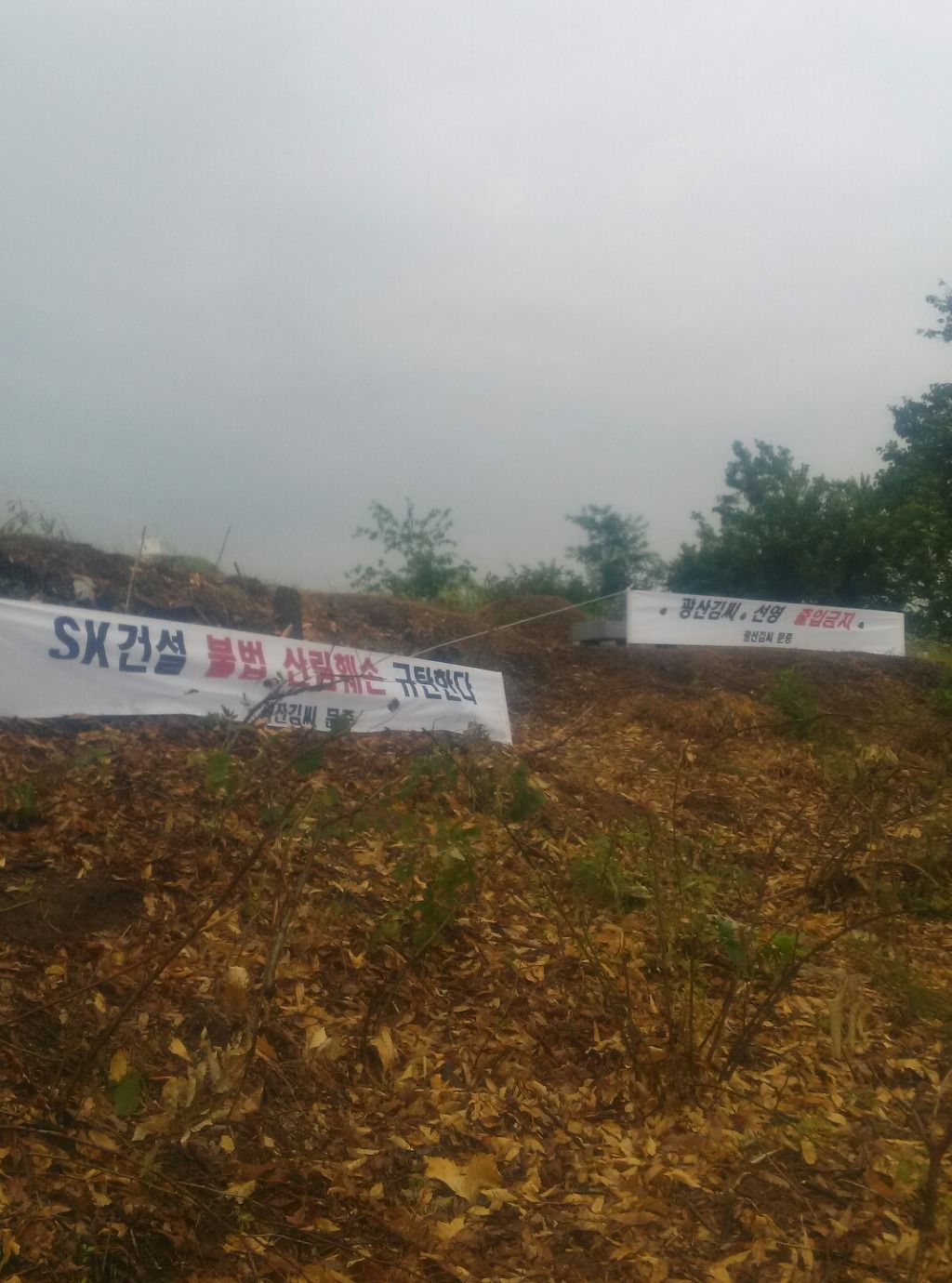 광산김씨 문중은 조상 대대로 내려온 문중 소유의 선영을 침탈하여 선산을 지키던 수많은 고목들을 벌목해버린 SK건설의 횡포에 깊은 정신적 충격과 분노를 표하고 있다. 또한 황폐하게 훼손된 선산에 SK건설의 불법벌목을 규탄하는 플래카드를 내거는 등 강력하게 항의를 하고 있다.