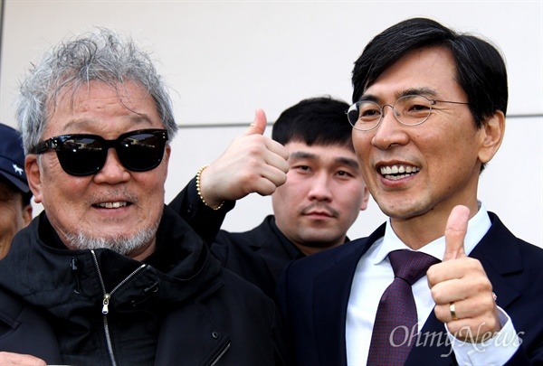 | 안희정 충남지사가 토크쇼에 참석하기 위해 19일 오후 김해체육관에 들어서면서 '안희정을 지지하는 사람들의 모임' 명계남 배우와 인사를 나누고 있다. ⓒ 윤성효 |