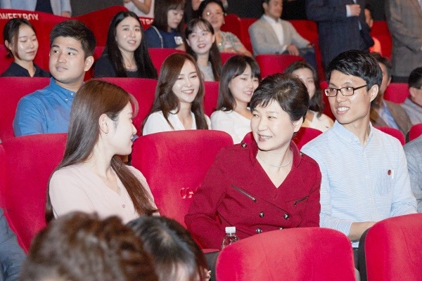 ▲2016년 8월 20일 박근혜 대통령이 영화 ‘인천상륙작전’을 관람하며 관객들과 인사를 나누고 있다.