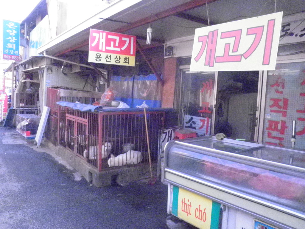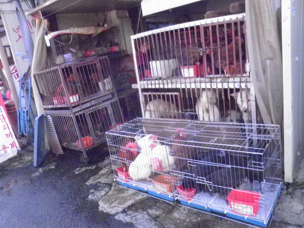 시장안 동물들 도축 우리안 살펴봐 동물가축도살 파는 상인 가계 골목 도로변에 가축우리설재 안에 붉은 재래 우리의 토종닭 개 토끼 갓쳐 비좁은 공간에 처량하게 보여 짐승들 자기동료 주검을 현장에서 목격하며 고통받으며 죽는 모습 피냄새 인간의 무잡이한 행위 벌서 운명을 체념한듯 기가죽어 슬픈눈빛 눈만굴려 가축주인보고 토끼 잡아주는데 . 가격을 묻니 토끼 크기따라 최저가격 1마리엔 도살 처분작업에 25000원 부터 40000만이란다고 하네요,