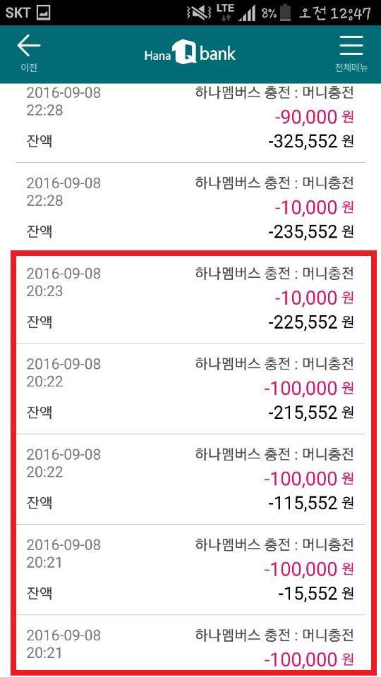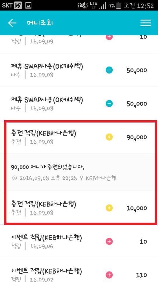 혹시나 해서 하나멤버스 앱을 이용하여 충전내역을 확인하였으나 9월 8일 오후 밤 10시 28분에