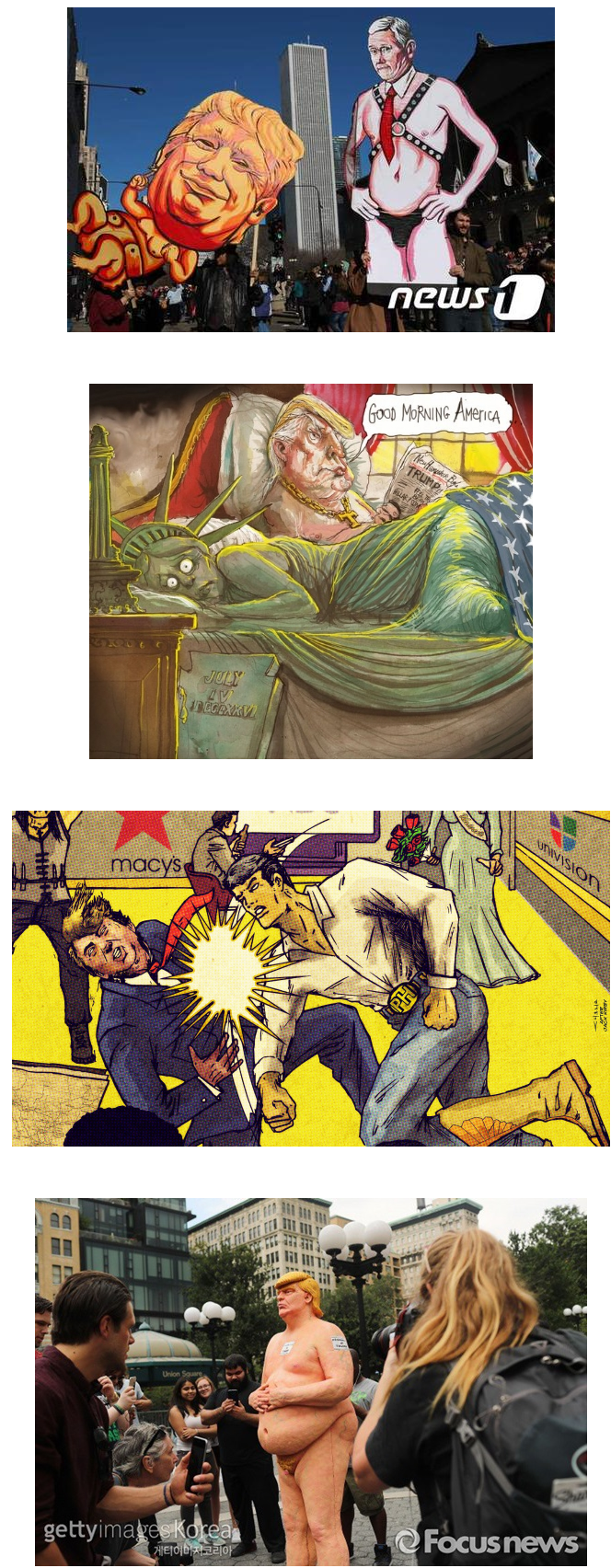 위 미국의 사진을 하나의 전형적인 예술을로 보느냐 아니면 풍자 해학으로보느냐 권력을 비꼬는 시니컬한 예술의 한 종류로 보느냐는 우리가 비도덕적인 권력을 조롱할수있는 정도 알수있는것이고