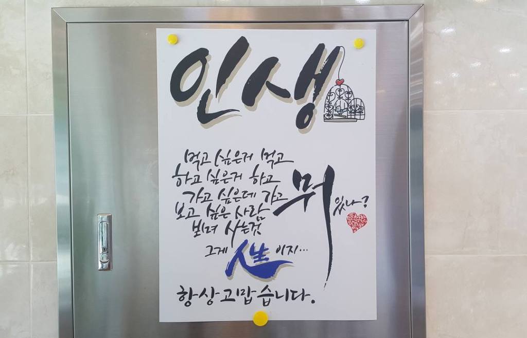 사진설명 : 식당 벽 배전판에 붙여놓은 한화생명의 홍보물이다.