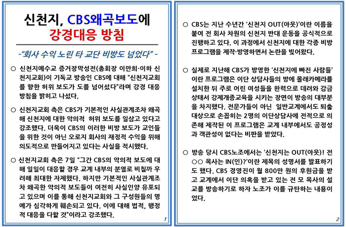 CBS는 지난 2011년부터 자회사인 노컷뉴스 등을 동원해 수년간 '신천지 OUT(아웃)'운동을 진행해왔습니다.