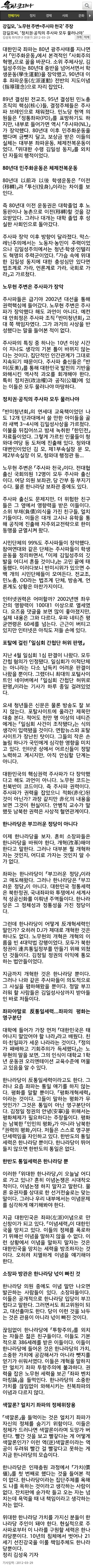 대학에 들어가 가장 먼저 「대한민국은 태어나지 말았어야 할 나라」라고 배웠다. 친미·친일파가 세운 나라라는 것이다. 『정의가 패배하고 기회주의가 득세했다』는 노무현의 말을 보면, 그의 인식이 대학교 1학년 운동권 오리엔테이션 교육수준에 머물고 있음을 알 수 있다.