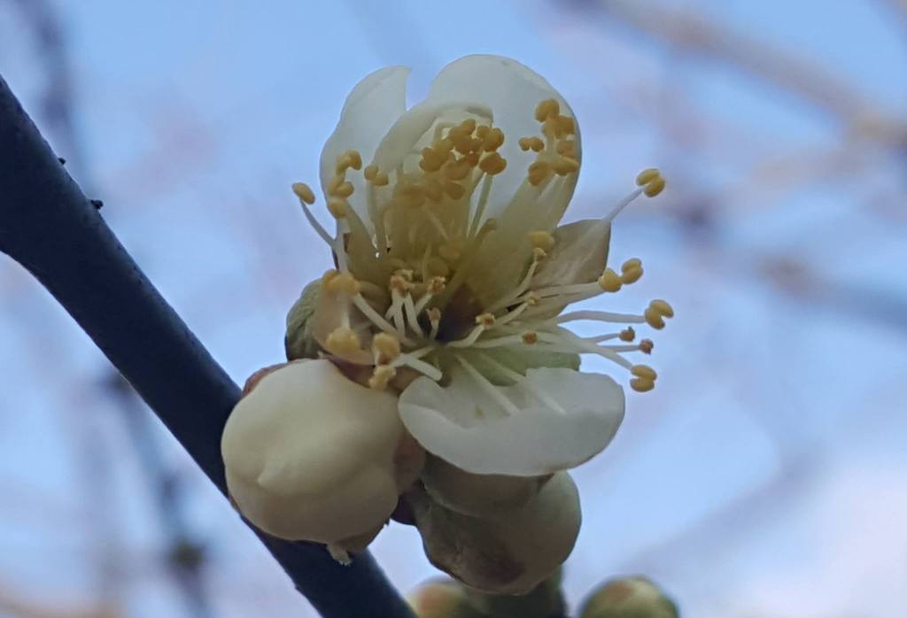 사진설명 : 강변의 빈 논배미와 봄볕에 피고 있는 매화꽃을 담았다.